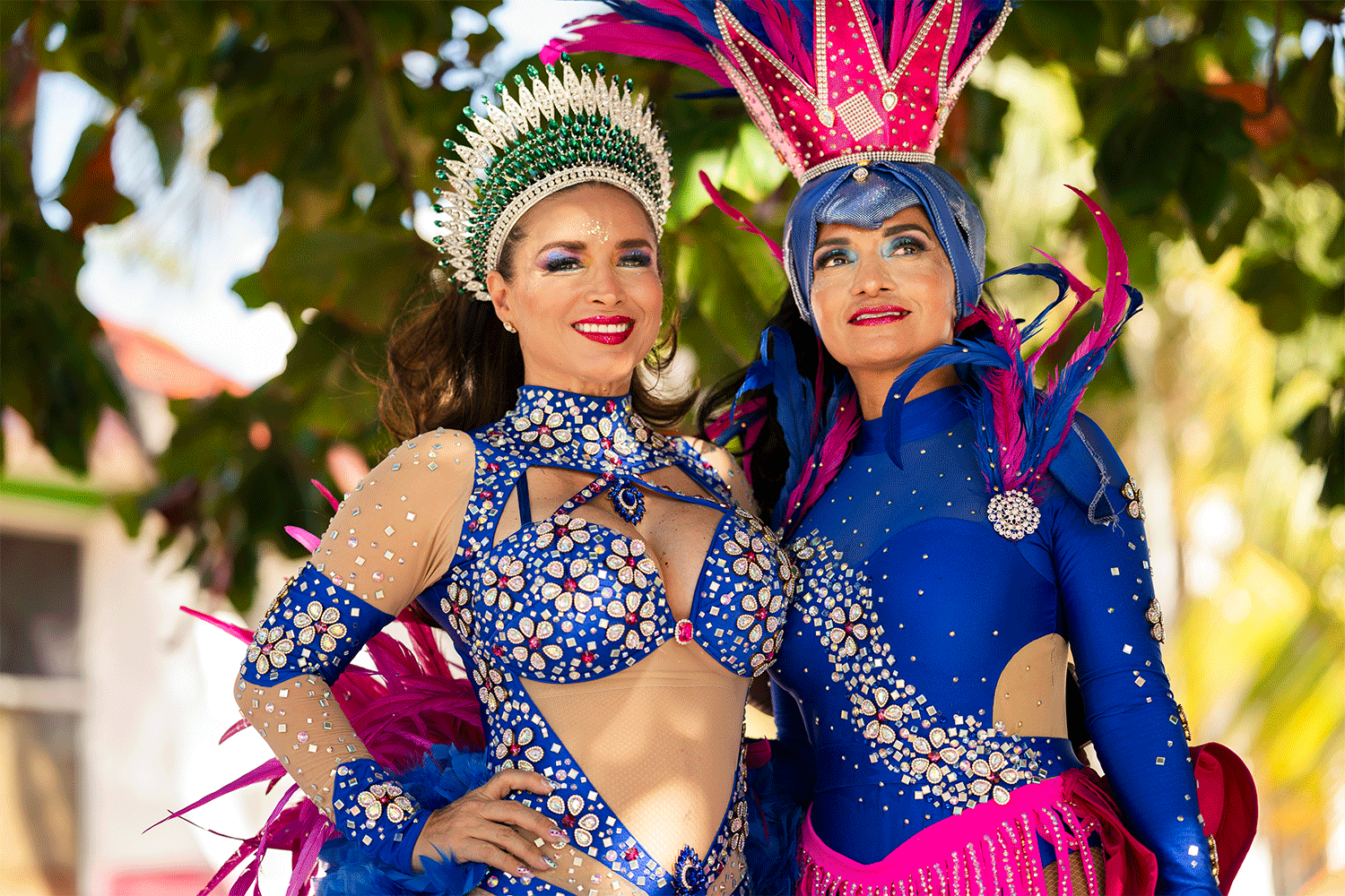 Carnival festivities bring bright feathery costumes to the island, celebrating the beginning of Lent.